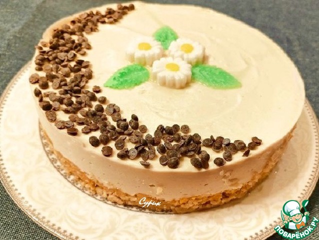 Выложить основу в разъёмную форму, застеленную пергаментом, и утрамбовать её. Размер моей формы 20 см и десерт в ней получается низким. Если хотите, чтобы он был более высоким и красивым, используйте форму меньшего диаметра. -