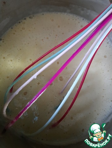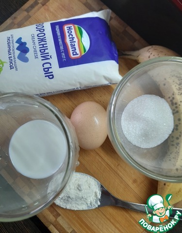 Смешиваем творожный сыр ТМ Hochland (в рукаве) и остывший банановый заварной крем до получения однородной массы