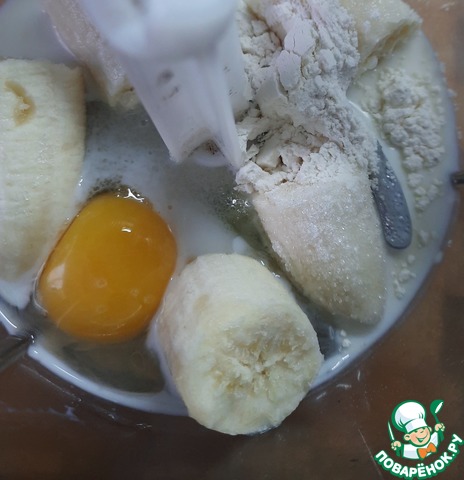 Смешиваем банан, сахар, яйцо, молоко и крахмал до однородного состояния в процессоре