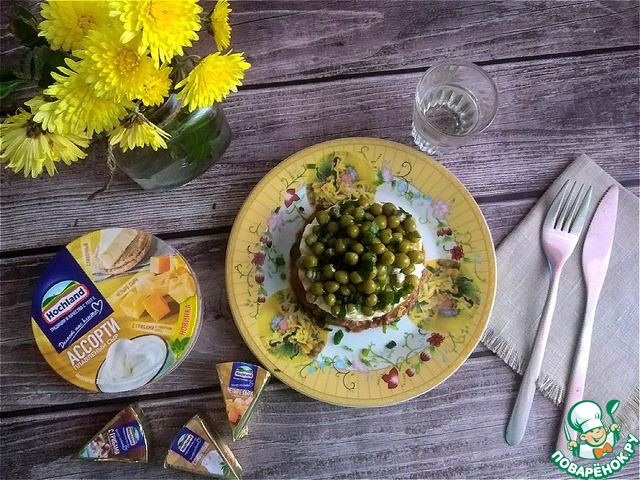 - Сыр плавленый (плавленные сырки в жёлтой упаковке ассорти ТМ HOCHLAND, в ней как раз 8 сырков в треугольниках) — 8 ломт.