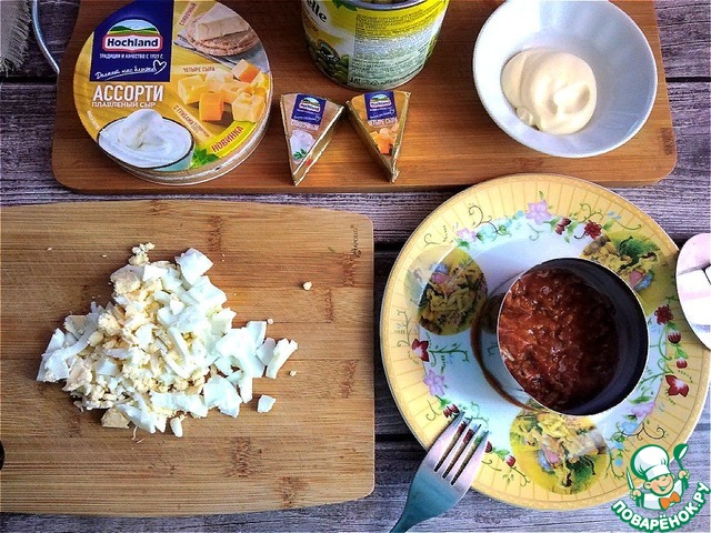На овощи выкладываем яйца и сверху на них - майонез. Я кладу по 1 ст л примерно на порцию. На яйцо - 0,5 ст л. Кладите по вкусу. На порцию берём по 2 треугольника сыра. Выбирайте на свой вкус. Я для себя возьму "4 сыра" и "сливочный". Мелко их порежем.
