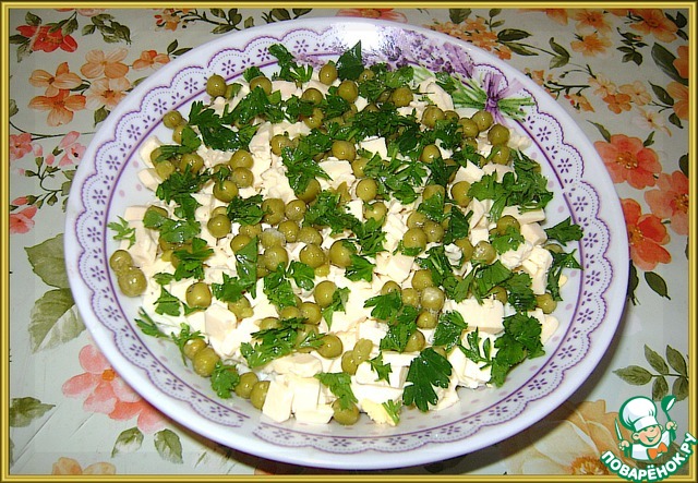 Последний слой - зелёный горошек. Банку с горошком тоже разделите визуально на 4 порции для индивидуальной подачи. Снимаем кольцо аккуратно. Присыплю немного салат рубленной петрушкой.