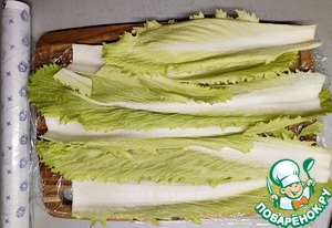 Капусту тщательно промыть, отрезать основание, разобрать на листочки. Листики разложить на пищевой пленке внахлест.