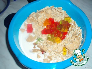 Выливаем сметану в миску, туда добавляем наше печенье и "битое стекло" из желе.