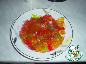 У меня желе уже приготовлено и порезано на кубики. Готовить желе по указанию на пачке, только воды добавить половину того кол-ва, которое указано. Дальше дать ему застыть и порезать.