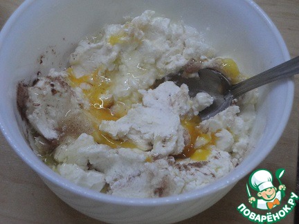 Для начинки творожный сыр вначале ложкой перемешайте с сахаром, яйцом, ванильным сахаром и корицей, а затем взбейте миксером в пышную, однородную массу.