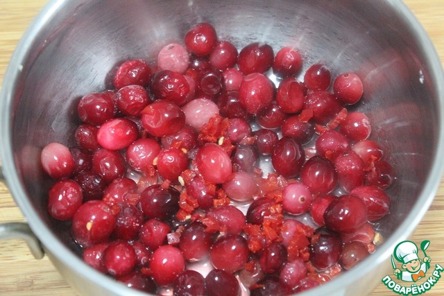 В сотейник сложить клюкву, добавить чили, щепотку соли, бальзамический уксус, поставить на огонь.