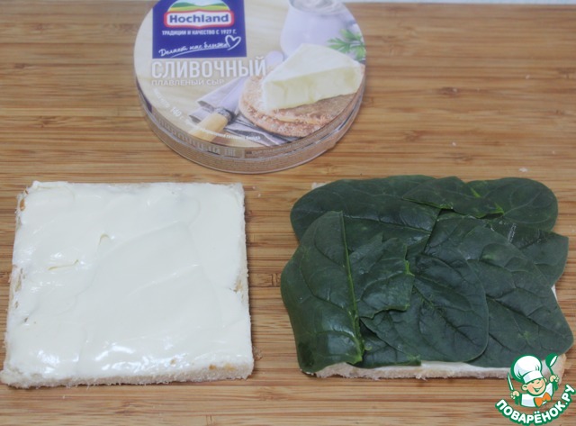 На один тост поверх сыра уложить листья шпината.