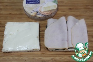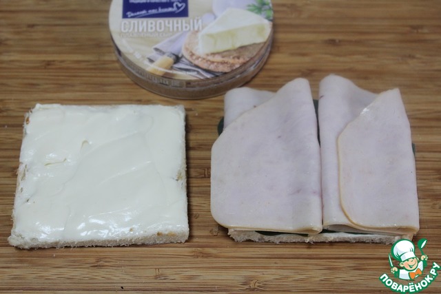 Намазать одну сторону у тоста плавленным сыром.