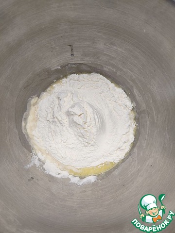 В дежу тестомеса сложить все ингредиенты для теста, кроме масла. Произвести замес в течение 5 минут на 1 скорости. Количество муки регулируйте по состоянию теста. Оно должно стать мягким, но упругим. Затем добавить масло порционно, продолжая замес. Брожение в теплом месте около 2-х часов.