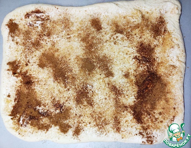 Пласт теста смазать мягким маслом, посыпать коричневым сахаром и корицей.