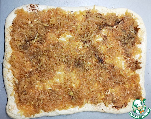 Яблоки заранее натереть на крупной терке, немного припустить в сотейнике до мягкости. Если яблоки кислые, добавить немного сахара. Яблоки остудить. Выложить на тесто ровным слоем.