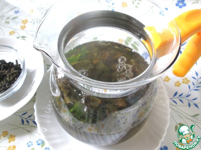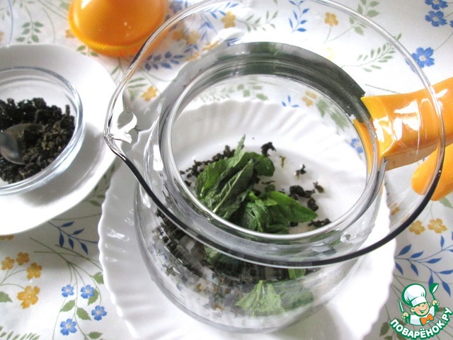 Чайник обдать кипятком. Затем положить 2 ч. л. зелёного чая и листики мяты.
