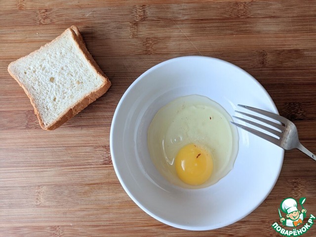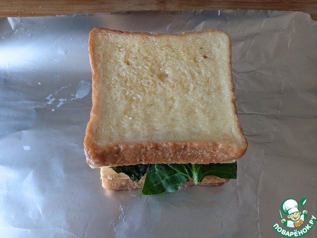 Второй ломтик хлеба обмакиваем во взбитое яйцо и кладём сверху на сыр. Если вы делаете два сэндвича, то сразу же соберите вторую заготовку и отправьте их в разогретую до 180 градусов духовку на 8 минут под верхний нагрев.