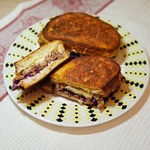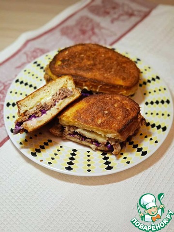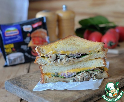 Подаём сэндвич сразу горячим, разрезав пополам. Приятного аппетита!