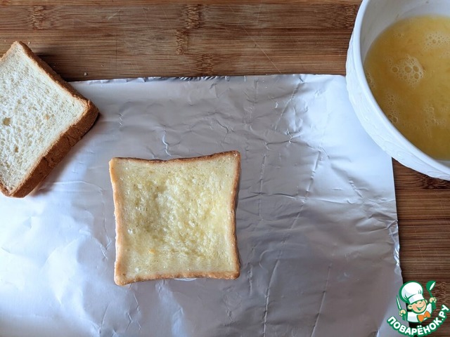 Берём лист фольги, смазываем маслом. Тостовый хлеб обмакиваем во взбитое яйцо, кладём на лист фольги.