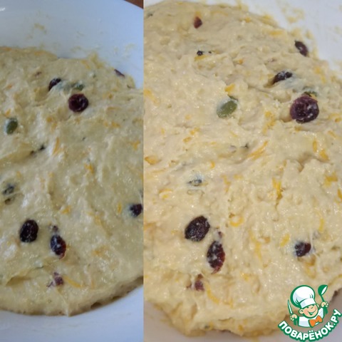Добавляем 450 гр муки, перемешиваем и добавляем семечки и клюкву