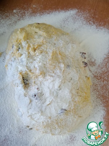Рабочую поверхность подпылить мукой и выложить тесто, само тесто тоже немного припорошить мукой