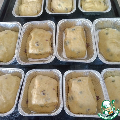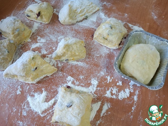 Тесто слегка обмять. Я пекла булочки в аллюминевых формочках, поэтому я руками сформировала пласт, толщиной примерно 2 см, и кондитерским шпателем разделила на кусочки.