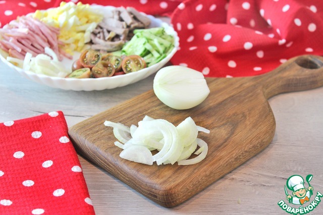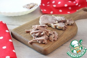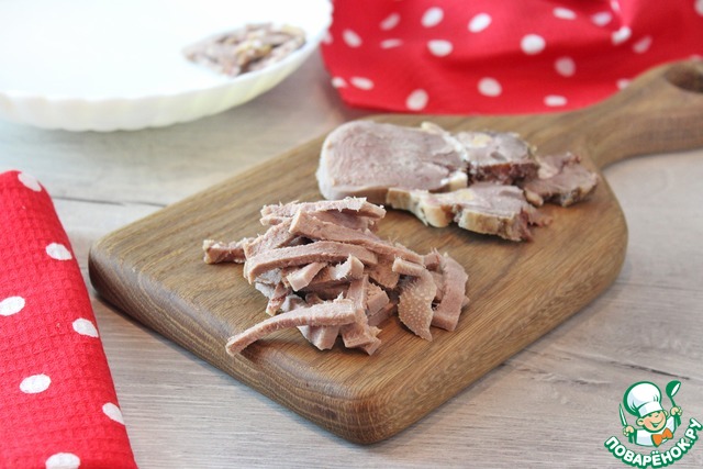 Отварной язык порезать полосками. Полоски языка уложить на блюдо кучкой.