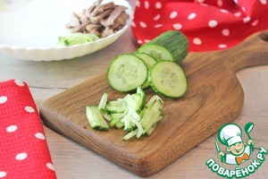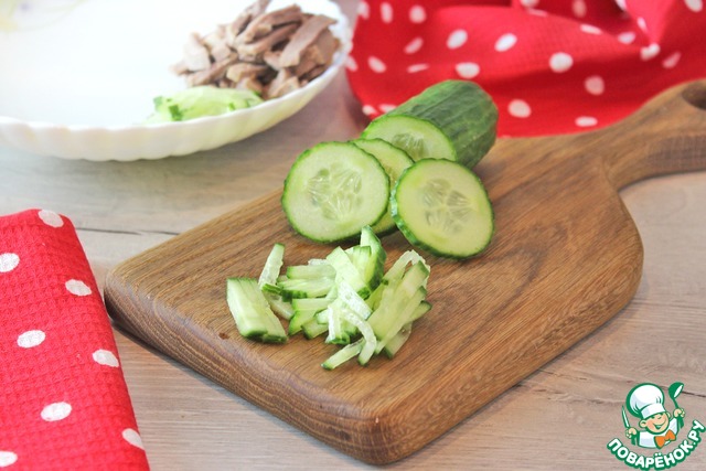 Огурцы помыть, обсушить, нарезать соломкой. Нарезанные соломкой огурцы сложить кучкой около нарезанного полосками языка.