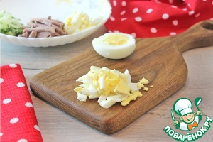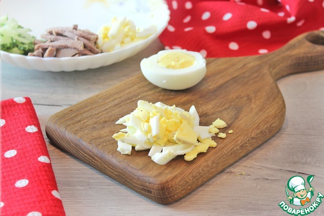 Яйца тоже нарезать соломкой и уложить кучкой около нарезанного полосками языка.