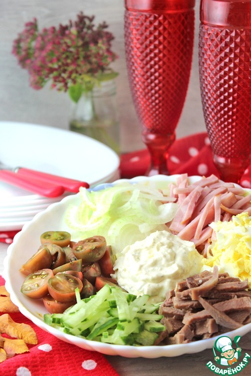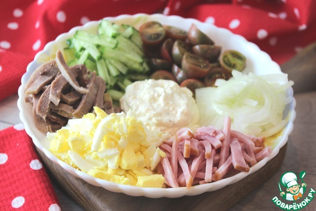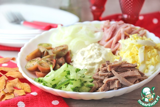 Я очень люблю салаты типа «мешанина»: они красиво смотрятся на столе, видно из каких ингредиентов приготовлен салат, не раскисают, так как размешиваются только перед употреблением. Представляю вам один из вариантов таких салатов – салат «Тайна Амстердама». Почему такое название не скажу, его рецепт мне любезно предоставила моя соседка, а вот про вкус расскажу. Язык, ветчина и яйца придают салату сытность, свежие помидоры и огурец – свежесть, репчатый лук и чеснок – пикантность, а заправка из творожного сыра – нежность. Очень вкусный салат! Рекомендую к сытному ужину, званному обеду, да и на любой праздник.
