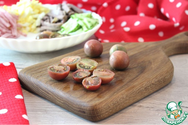 Помидоры – черри помыть, обсушить, разрезать на половинки. Выложить половинки помидор кучкой на блюдо около нарезанных соломкой огурцов.