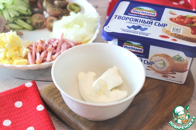 Приготовить заправку для салата. Для этого в емкость выложить необходимое количество творожного сыра ТМ Hochland.