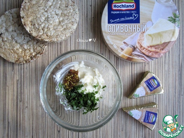 Плавленый сыр разомните, смешайте с горчицей и петрушкой.