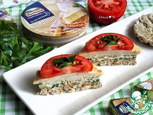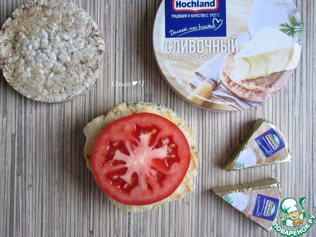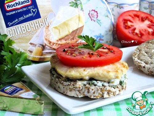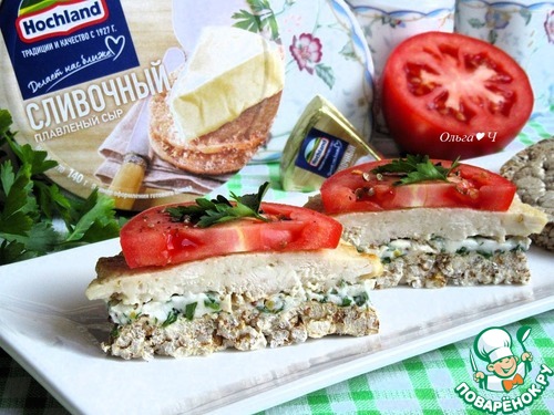 Сытный бутерброд с куриной котлетой, помидором и сливочным плавленым сыром ТМ Hochland, приготовленный на злаковом хлебце. Вкусно, просто и быстро. Попробуйте!