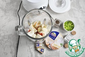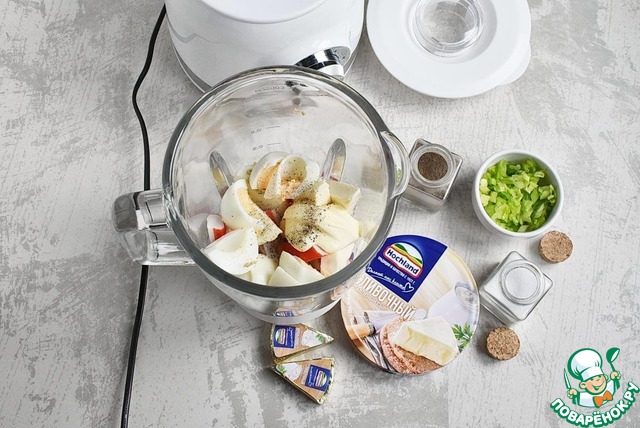 1. В чашу блендера выложить крабовые палочки. Можно порезать их для удобства. Туда же положить вареные яйца, треугольнички сливочного сыра Хохланд, немного майонеза, соли и перца. При желании можно добавить немного лимонного сока.