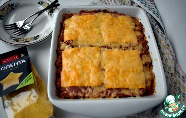 Запеченная полента с мясным фаршем, ветчиной и сыром готова.