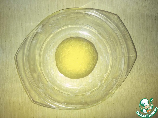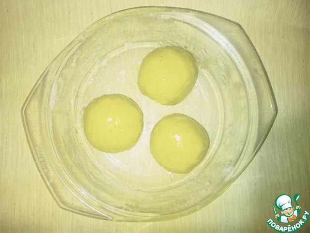 Разделите тесто на 3 части, смажьте растительным маслом, накройте, оставьте до полного остывания, уберите в холодильник на 2 часа (я оставила на ночь).