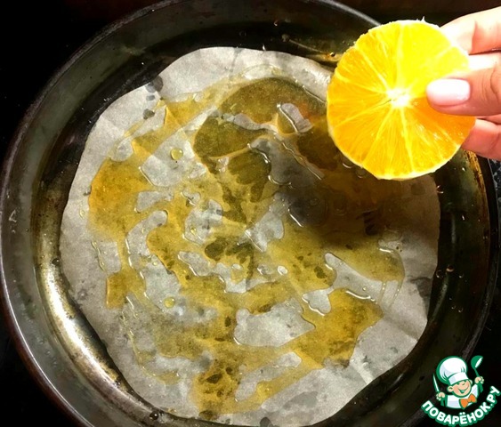 Форму для выпечки застелить пергаментом, полить мёдом и выложить кружочки апельсина. У меня вошло 7кружочков)