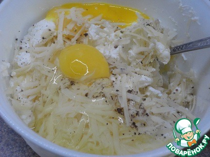 Для начинки соедините творожный сыр с натертым на терке пармезаном, яйцом, яичным желтком (белок понадобится попозже), свежемолотым черным перцем. По желанию можете слегка посолить.