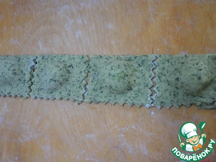 Накрыть второй второй половиной теста, прижать руками вокруг начинки. После этого колесиком для теста вырезать равиоли.