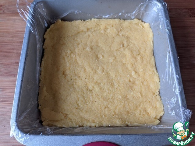 Застилаем форму плёнкой, кладём поленту ровным слоем, около 0,8 см. У меня форма 20 на 20 см. Ставим до полного остывания и стабилизации минимум на 3 часа. Сверху тоже накрываем плёнкой. Я ставила на ночь.