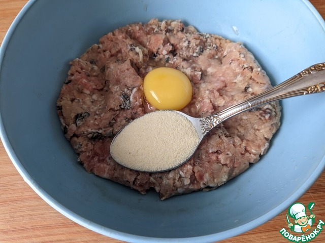 В фарш кладём яичный желток, манную крупу, соль. Хорошо вымешиваем. Оставляем на 20 минут для набухания манки. -