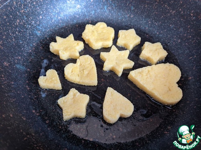На горячую сковороду наливаем масло и обжариваем фигурки из поленты на среднем огне до золотистости. У меня ушло по 2 минуты. Не пересушите! Обжаренные фигурки из поленты убираем на тарелку. Вы спросите: "Куда обрезки?" Их тоже обжарить. Ну, а съедят - мама и бабушка.