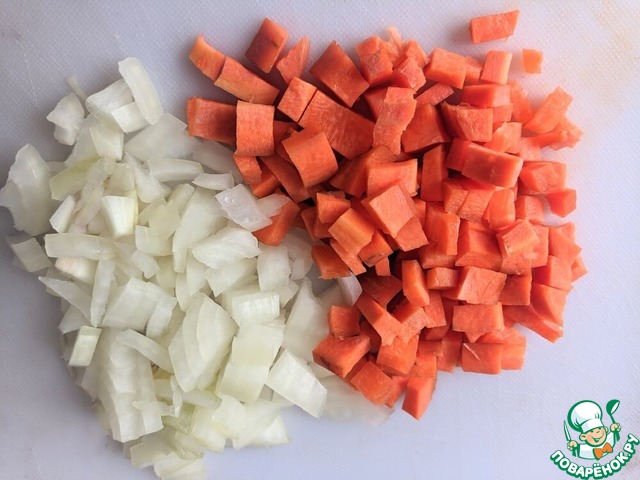 Лук и морковь чистим, режем кубиками. Можете натереть морковь, но мне нравится больше в нарезке.