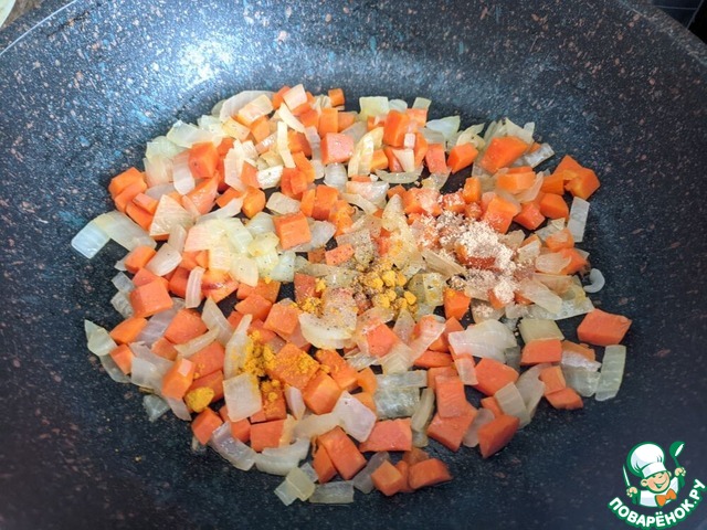 На туже сковороду, где жарилась полента доливаем масло, кладём лук и морковь. Обжариваем на среднем огне до мягкости около 10 минут. Добавляем соль, перец, имбирь и карри. Перемешиваем. Если вы готовите детям, то карри можно с 6 лет, перец с 5 лет, имбирь с 2 лет.