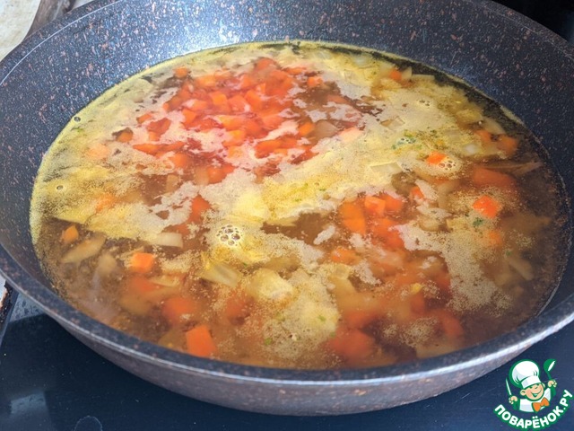 Заливаем зажарку бульоном, доводим до кипения. Я готовила суп в сковороде, половину указанного количества. На данном этапе можете переложить зажарку в кастрюлю, залить бульоном и продолжать варить.
