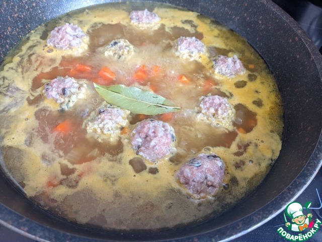 Кладём фрикадельки в кипящий бульон с овощами, добавляем лавровый лист. Доводим до кипения и варим на среднем огне 10 минут.