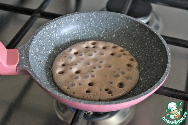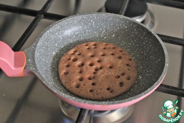 Приготовить тесто для блинов. Для этого в емкость влить необходимое количество молока, добавить дрожжи, разрыхлитель, какао-порошок, соль, сахар, хорошо перемешать венчиком. Затем просеять муку и заместить жидкое тесто для блинчиков. Дать тесту отдохнуть минут 30. За это время дрожжи активируются, и тесто станет «дышащим», с пузырьками.