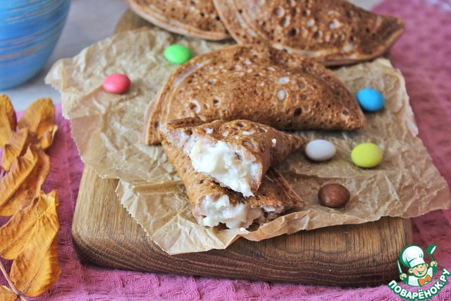 Кто ко мне на осеннее чаепитие?! Заходите! Буда угощать вас вкусными блинчиками. Они такие шоколадные, дырчатые – придырчатые, а какая в них вкусная начинка – нежно-сладкий творожный сыр с грецкими орехами! Одно удовольствие! А готовятся просто и быстро!