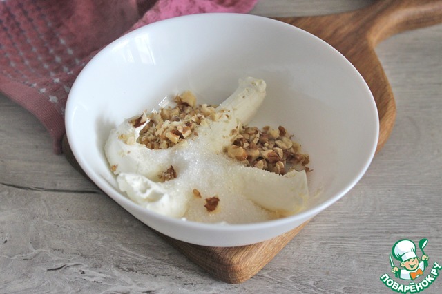 Добавить сахар и мелко порубленные ядра грецкого ореха.