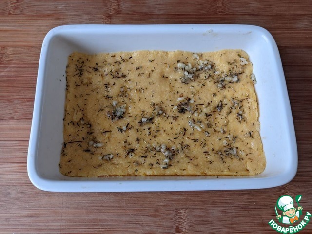 Готовую поленту кладём ровным слоем в смазанную маслом форму, разравниваем. У меня толщина около 1 см. В пиалке смешиваем растительное масло (1 ст. л), выдавленный чеснок, Прованские травы.