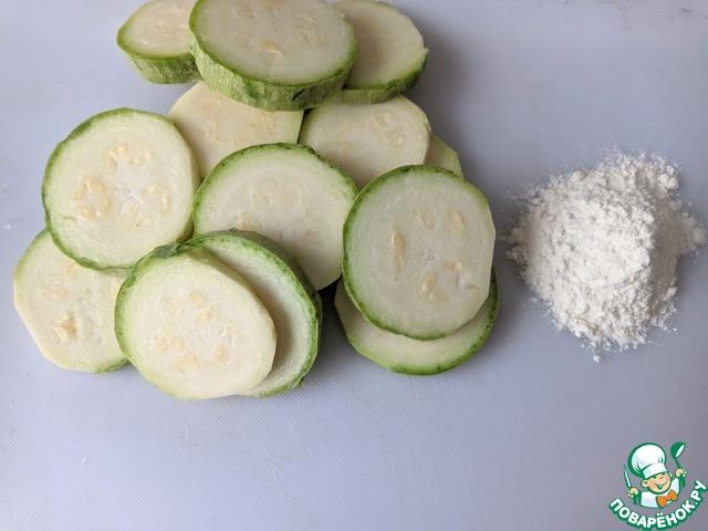 Цуккини моем, режем кружками толщиной около 8 мм. Обваливаем в муке.