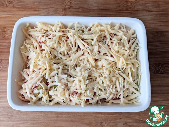 Сверху посыпаем тёртым сыром. Сыр должен хорошо плавиться, можно брать моцареллу. Ставим в духовку на 200 градусов под верхний нагрев (гриль) на 15-20 минут.